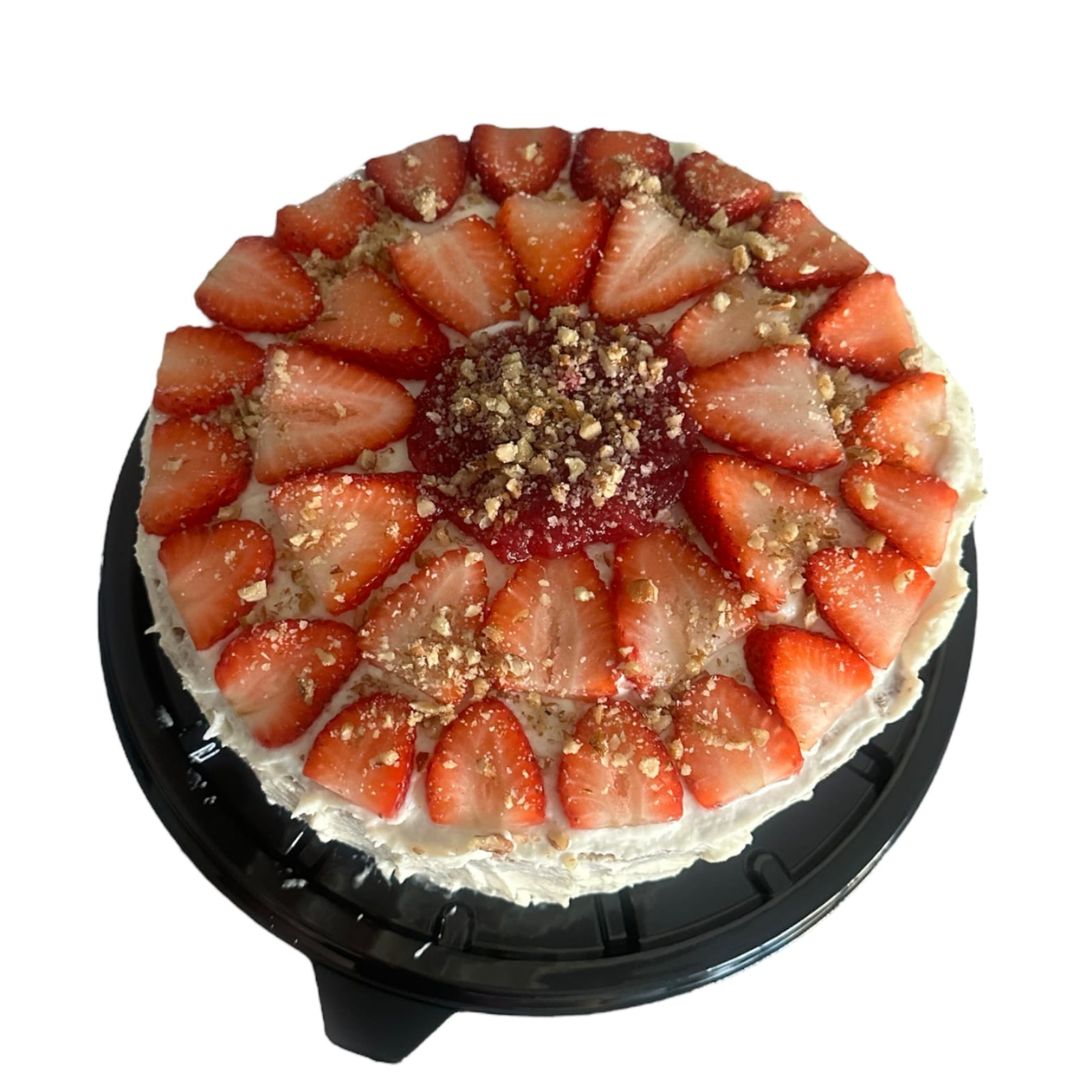 Pan de vainilla remojado con bebida de almendras, relleno de mermelada de frutos rojos, cubierto con suave crema, nuez y rodajas de fresa.